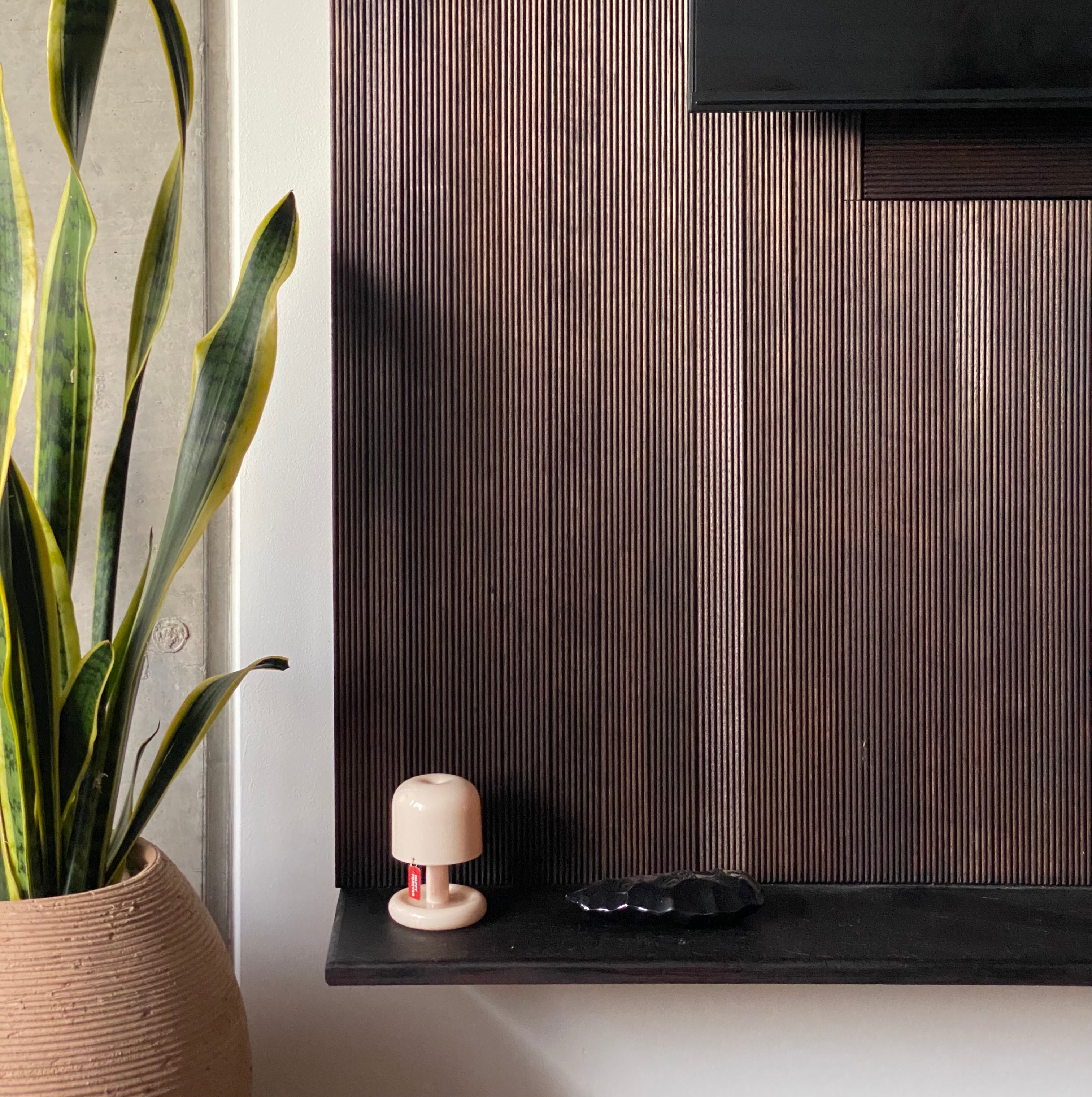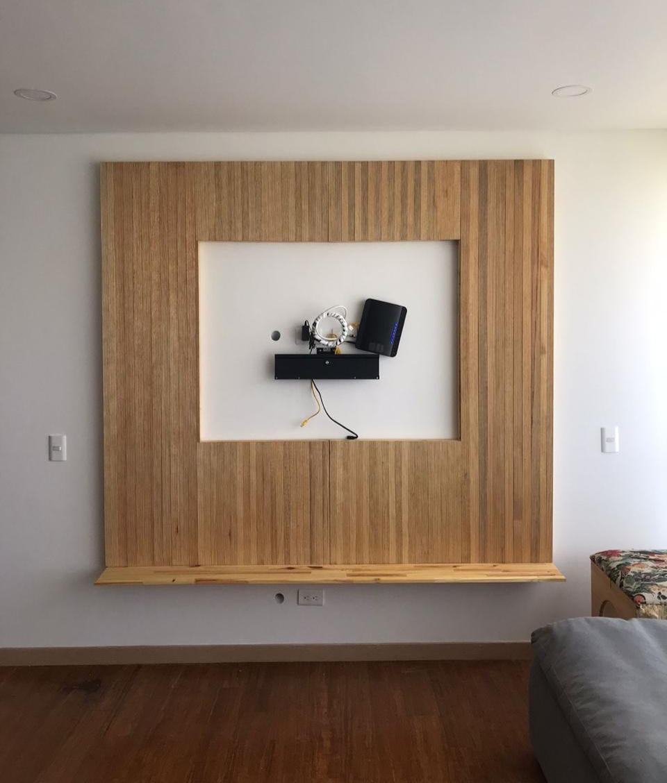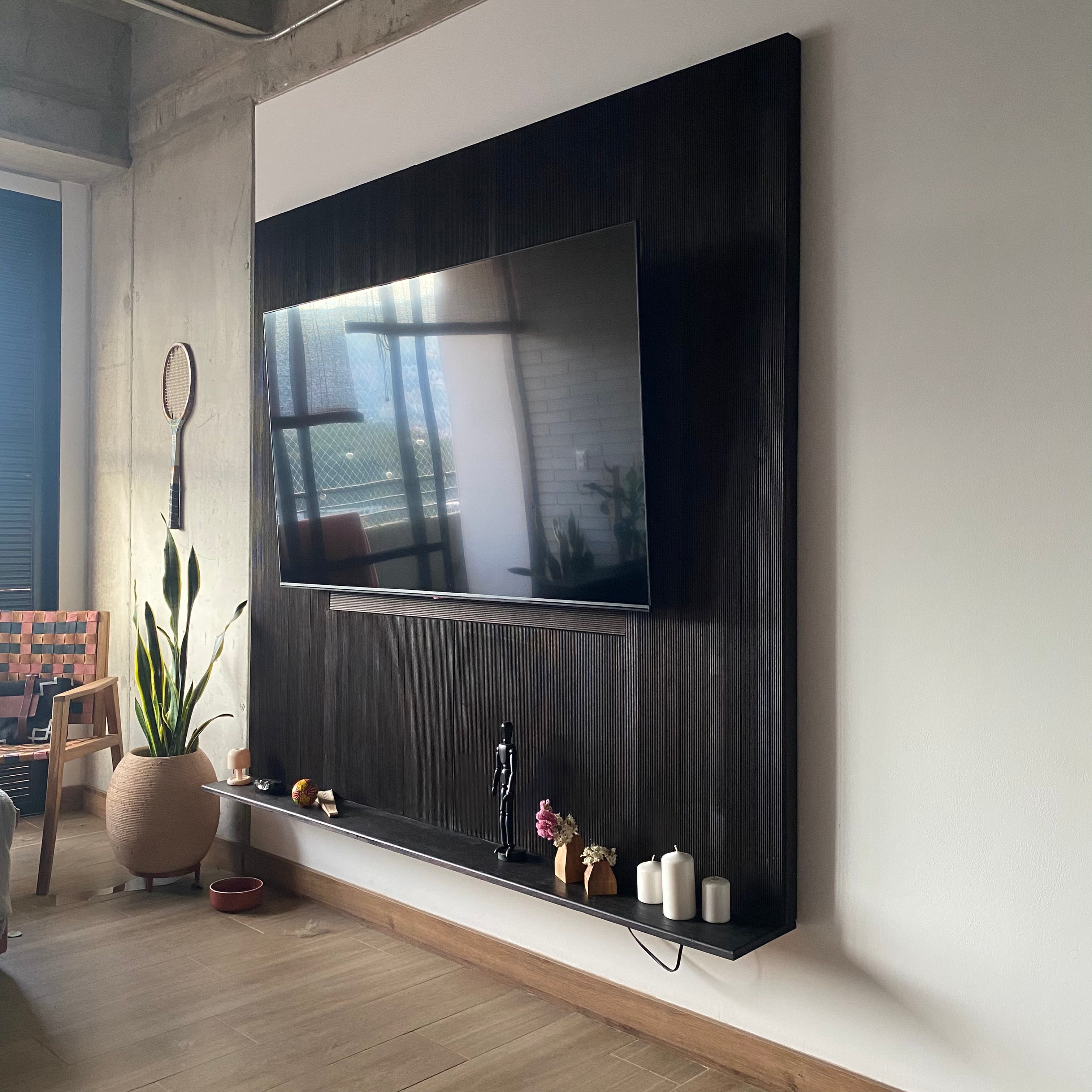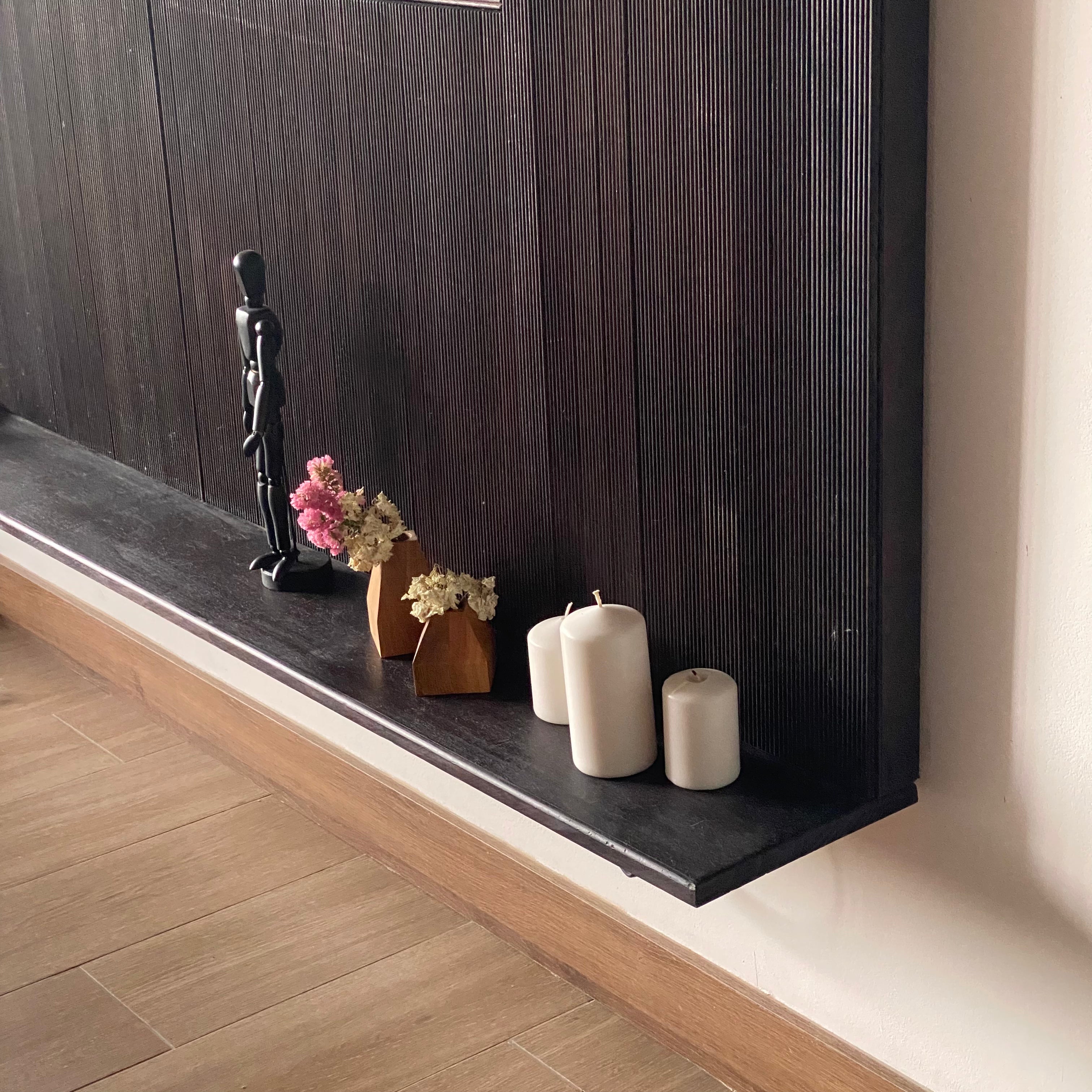 Este mueble utiliza las molduras en madera para crear una textura sobre toda la superficie y darle a esta consola un aspecto contemporáneo en la sala de nuestros clientes.