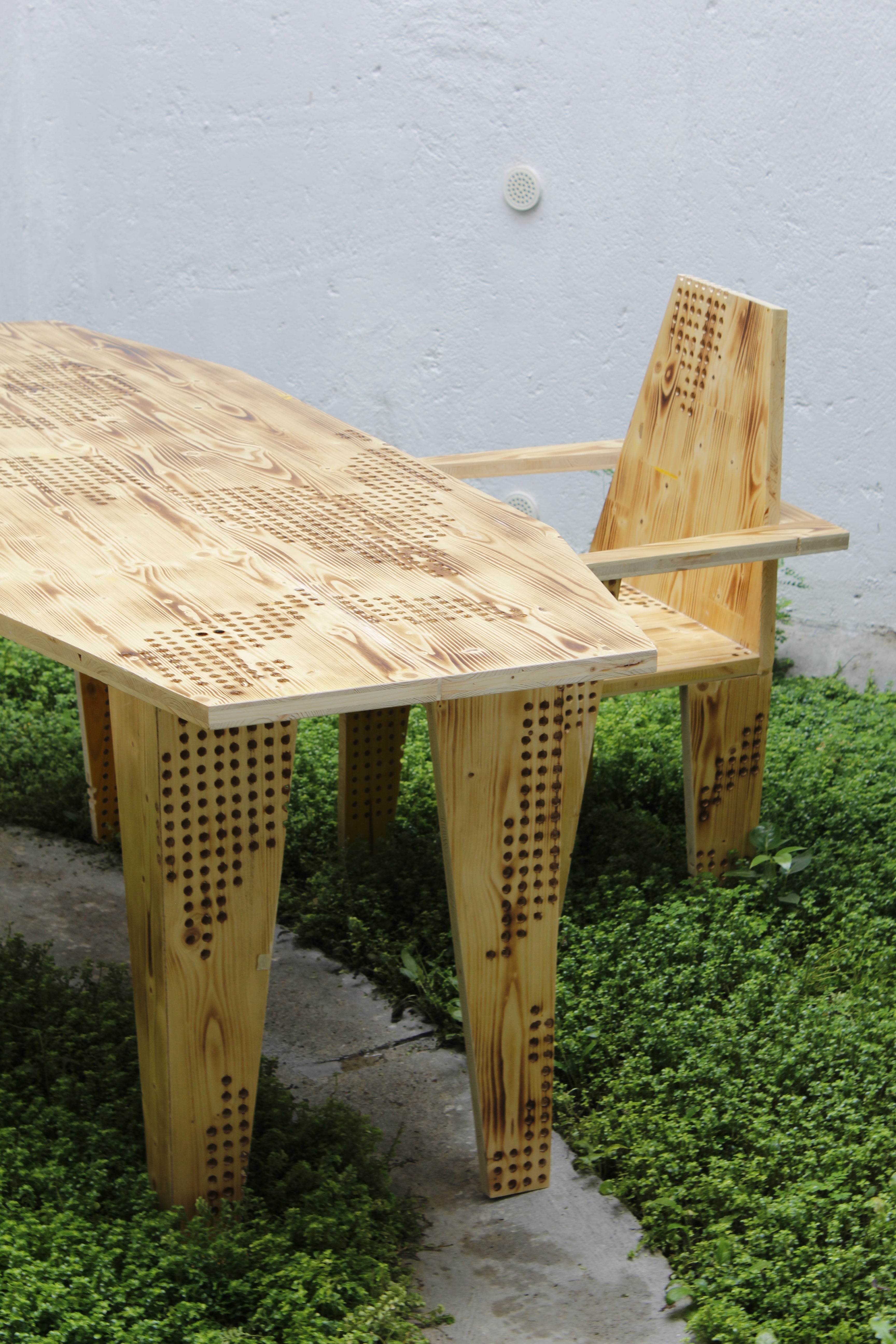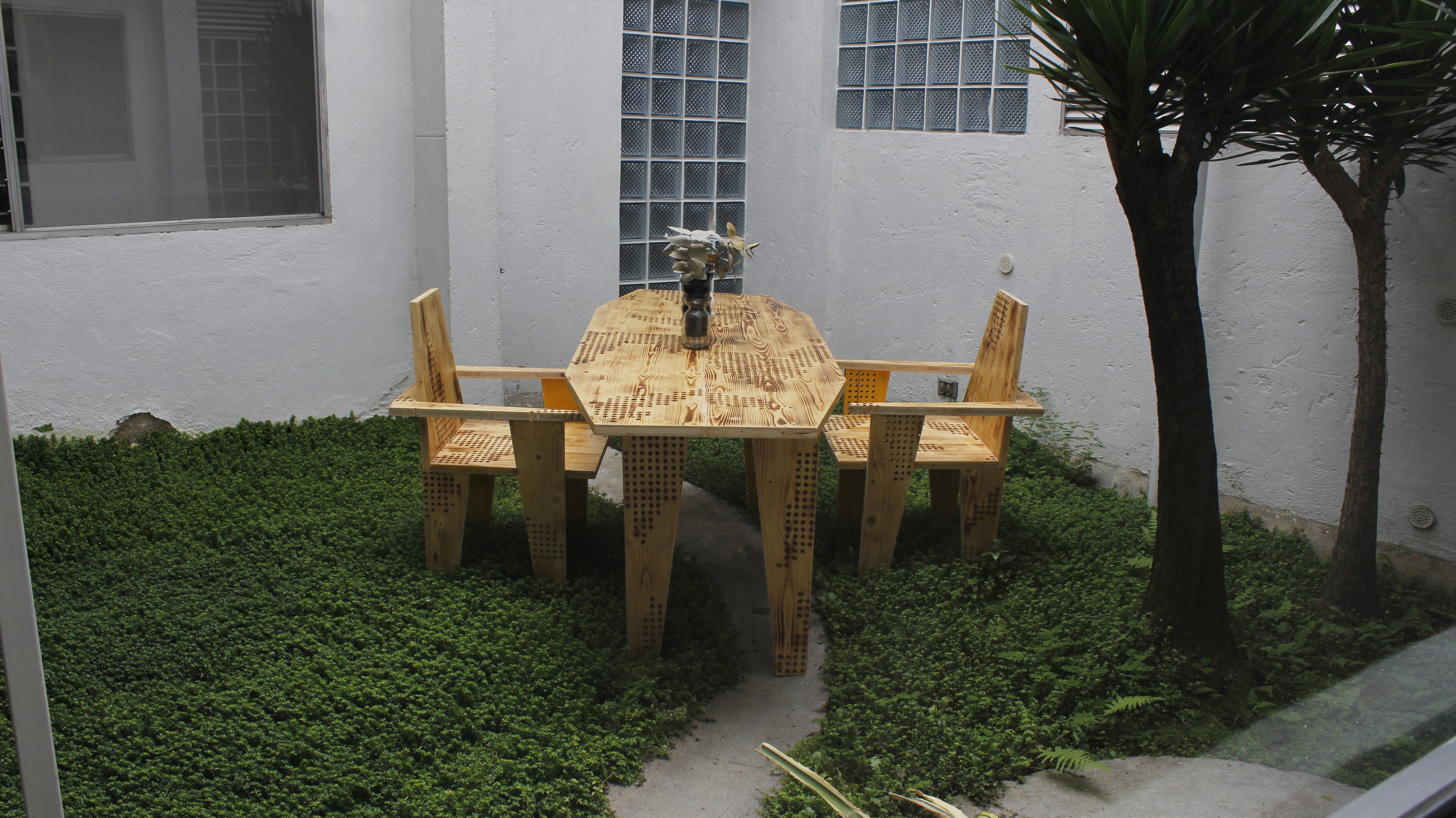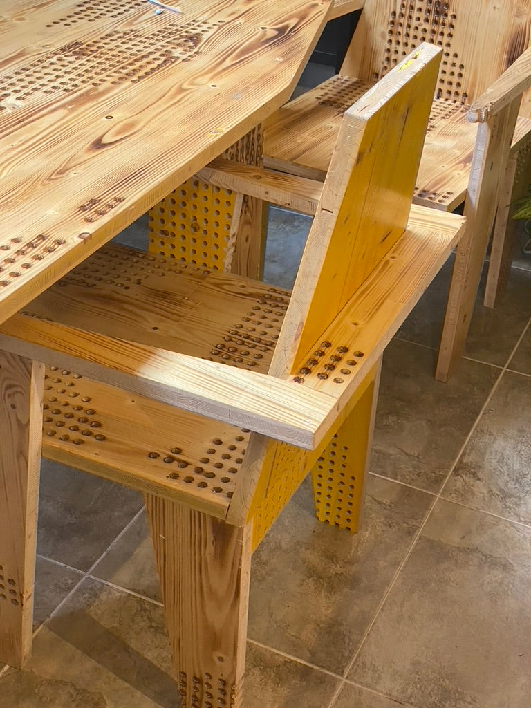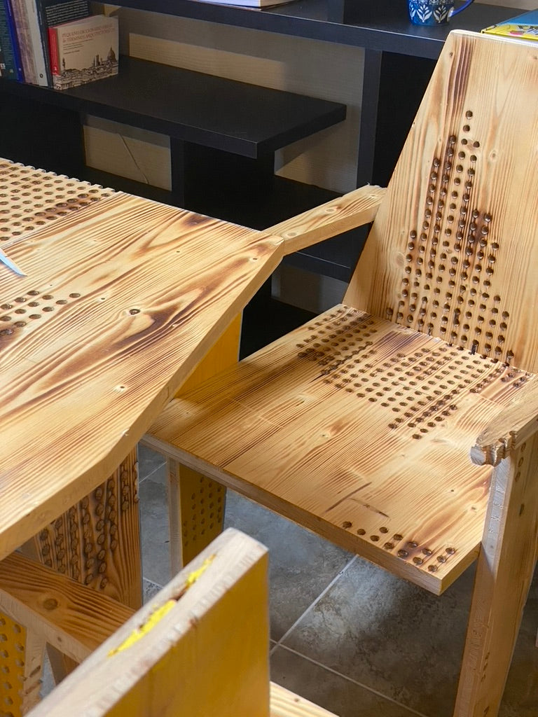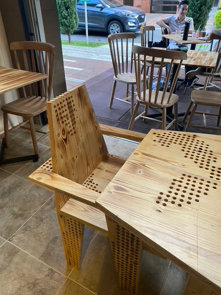 Para su apertura en 2023, diseñamos y fabricamos junto a Proyecto Café las sillas de su espacio apartir de una madera recuperada con una textura característica, lo cual guió el diseño de las sillas y mesas. Se reutilizaron los paneles de una exhibición de arte que ya habían cumplido su uso.